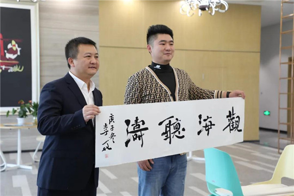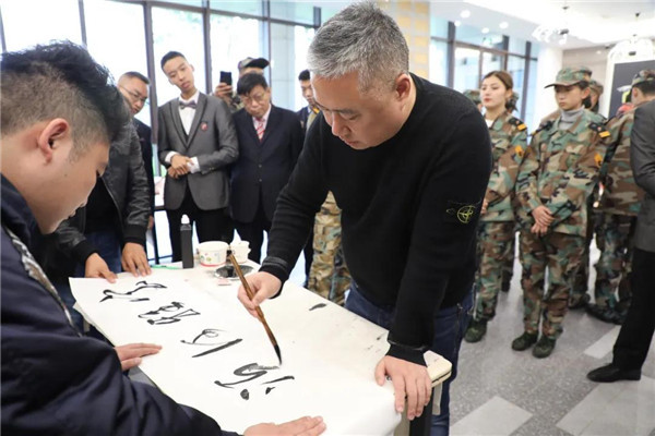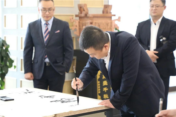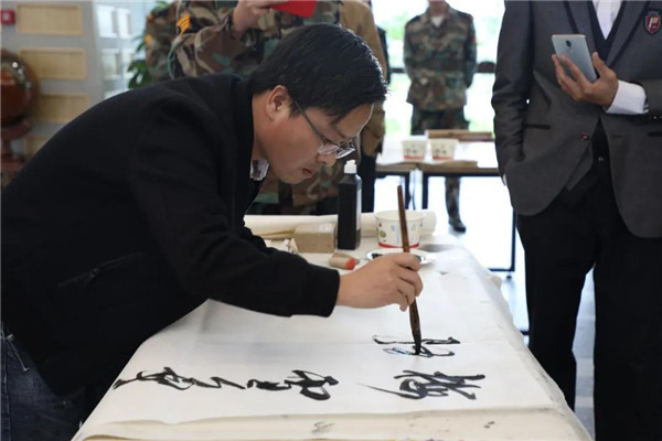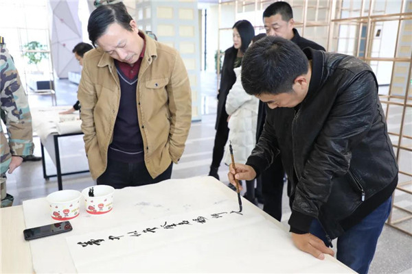 笔会期间,恰逢董事长魏全斌先生陪同省外嘉宾参观绵飞院。董事长魏全斌为参观嘉宾一一介绍书画作品,并亲自挥毫泼墨,书写楹联佳句。