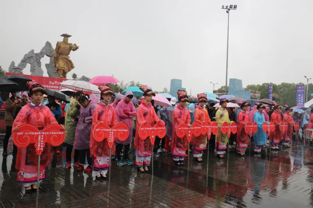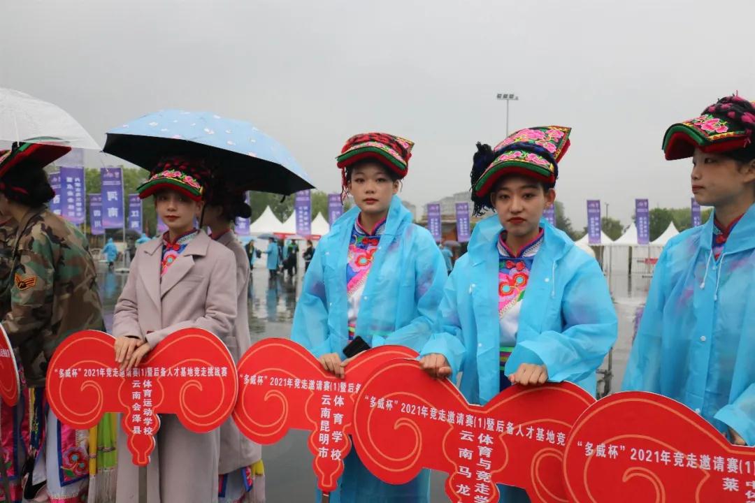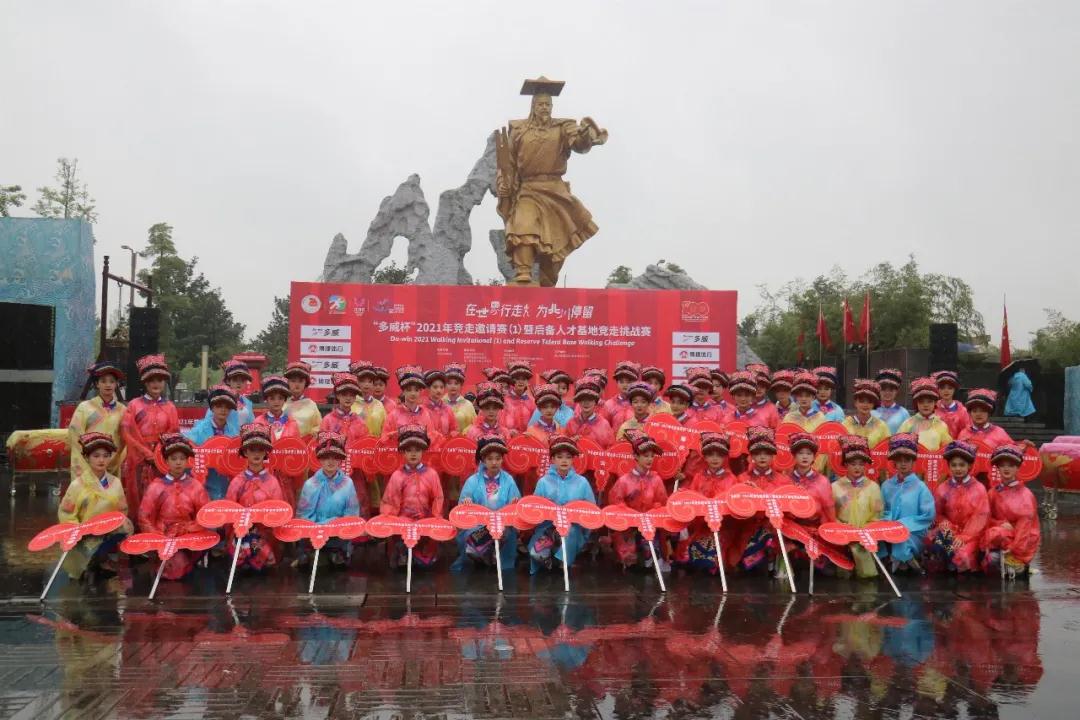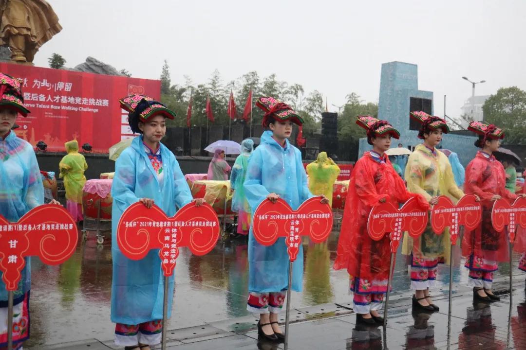 4月9日上午伴随着春雨,2021年竞走邀请赛(1)暨后备人才基地竞走挑战赛在四川省绵阳市北川羌族自治县隆重举行开幕式,52名绵飞学子作为52支参赛代表队举牌礼仪亮相。
