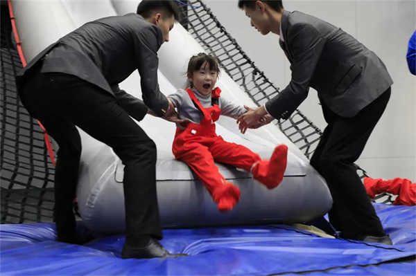 静舱逃生——在实训楼b737-800客舱撤离训练舱前,听绵飞校王涛老师讲解静舱逃生背景情况和防冲撞姿势。小营员们换上静电服,经过热身运动,一个个登舱勇敢尝试静舱逃生训练。