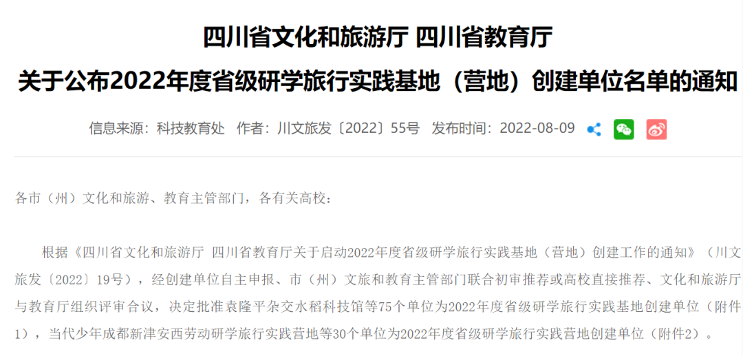 近日,四川省文化和旅游厅、四川省教育厅联合下发通知,公布了2022年度省级研学旅行实践基地(营地)创建单位名单,共75个基地、30个营地入选。神彩app下载航空主题研学基地成功入选!