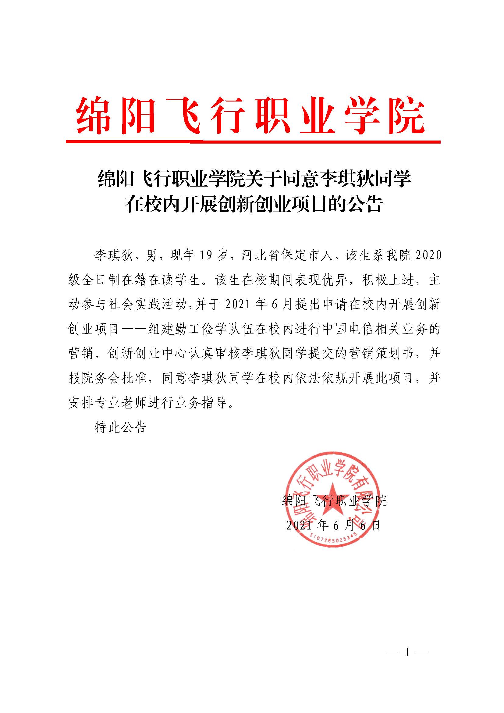 关于同意李琪狄同学在校内开展创新创业项目的公告