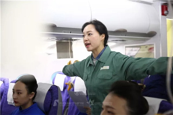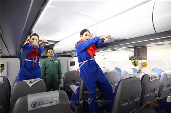 ▲春秋航空台湾地区的新乘们在泛美教育集团院校乘务培训中心进行培训