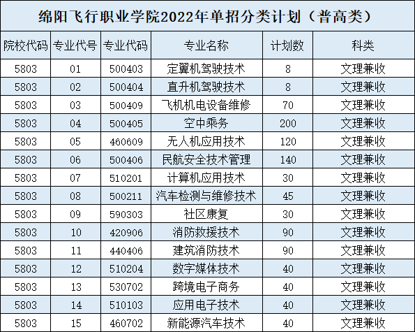 绵飞院单招专业及计划