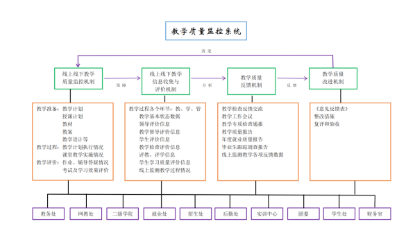 1.线上线下教学质量监控机制。学院教学过程质量监控系统是指学校根据监控标准对教学前(教学准备)、教学过程、教学后(考试及评价)三个阶段中关于教学设计准备情况、教学计划执行情况💂🏽♀️、课堂教学实施情况、课后作业及辅导答疑情况0️⃣、考试质量及学习效果评价等实施的监控。
