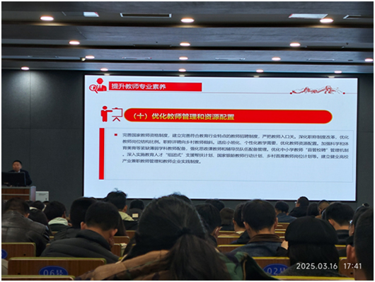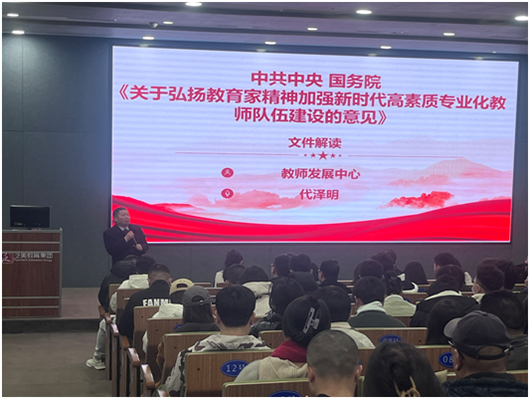 3月16日🈲,神彩app下载教师发展中心主任代泽明教授主讲了《关于弘扬教育家精神加强新时代高素质专业化教师队伍建设的意见》文件解读讲座,全体教师参加学习。本次培训围绕文件核心框架🚊,结合学院办学实际,系统解读新时代教师队伍建设的战略要求🌪,为加强教师队伍建设提供理论支撑与实践指引🏌🏽。